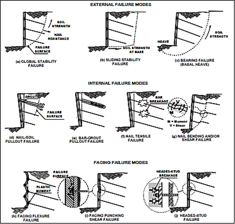 - مقاومت حالت حدي: در واقع حالت حدي مقاومت وقتي بدست ميآيد كه يك يا دو مد گسيختگي تشخيص داده شود در طراحي ديوار ميخكوبي شده بايد اطمينان حاصل شود كه ديوار در برابر تمام مدهاي گسيختگي ايمن است.